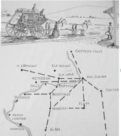 After 1850 the federal government began to help finance railroads and this financial help greatly increased the amount of track that was being laid. Wisconsin began planning and locating sections of track with the Menomonie area lumber business in mind. It was thought that Menomonie would receive direct rail service, but due to the location of Elk Lake, rail service was moved north two miles, with Menomonie being serviced with only a spur line. As the rail line expanded west, the route took it north, bypassing the 1850 “Hudson Road” Stagecoach line that ran from Eau Claire through Elk Lake to Hudson. This had a negative effect on the stagecoach line that followed close to Elk Lake. It also dramatically affected all local businesses.
