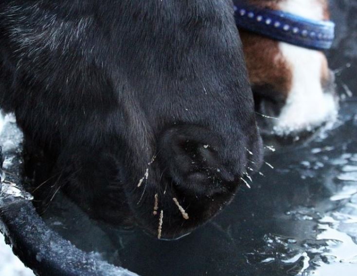 Never assume they are drinking! Just because water is available does not mean your horse is drinking enough. Horses should drink about 3 7 to 45 litres of water per day in order to stay healthy, and they will often drink less water when it is icy cold, particularly if there are any dental issues. It is also a misnomer to believe all horses will break through a thin layer of ice to access their water source. A heater is the best option, not only for the fussy drinker but also to ensure troughs do not freeze over during overnight hours or on frigid days. A Penn State University study has shown that increasing water temperature from just above freezing to 39-64° Fahrenheit will increase the amount of water consumed by up to 40%. Make sure the heater is properly installed and check if it is in good repair and operating safely. If you see horses standing by a trough but not drinking, be sure to check there is no electric current due to a malfunctioning heating element.
